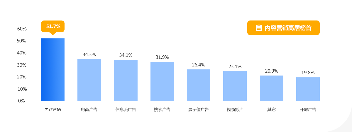 根据艾瑞咨询的报告显示,有41.8%的受访广告主愿意在未来一年内为内容营销增加预算。同时在对“2020年广告主预计未来一 年将增加营销预算的广告形式”的调查中,内容营销所占的比例也达到了51.7%。这也从另一角度反应了企业营销战略向“内容”的倾斜, 内容战略成为整体增长的重要组成。